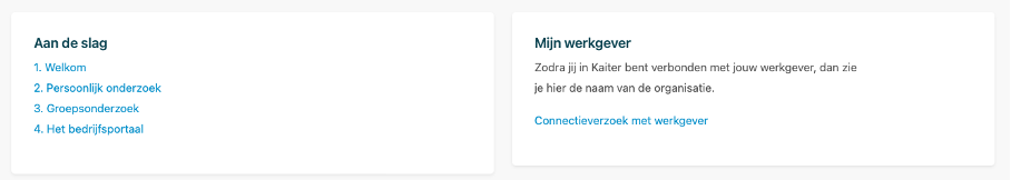 Als je gebruik wilt maken van de voorzieningen die je werkgever via het platform aan jou aanbiedt, dan kan je hier een connectieverzoek doen. Staat hier de naam van een organisatie weergegeven, dan ben jij binnen Kaiter verbonden met die organisatie. Je kunt de gegevens van de organisatie bekijken door in dit venster op de naam van de organisatie te klikken.