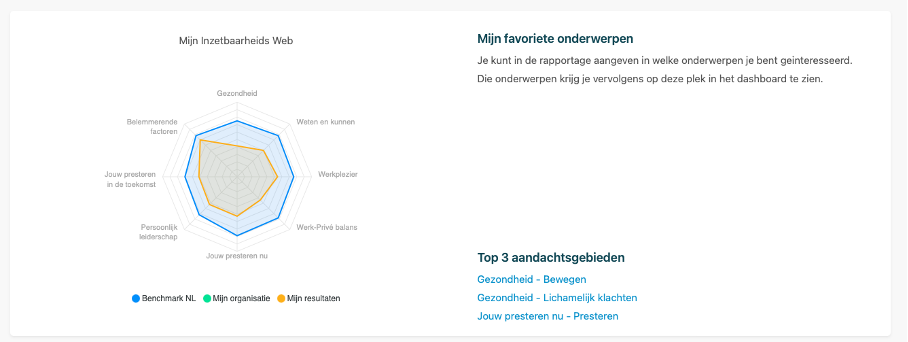 Hier worden de onderwerpen getoond die jij in jouw rapportage van een persoonlijke vragenlijst als favoriet onderwerp hebt aangemerkt. Heb jij ook de rechten om namens jouw organisatie groepsanalyses te doen, dan worden hier eveneens de als favoriet aangemerkte onderwerpen uit de groepsrapportage getoond. De informatie en het bijbehorende aanbod wordt voor jou zichtbaar als je op een van jouw favoriete onderwerpen klikt.